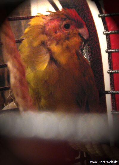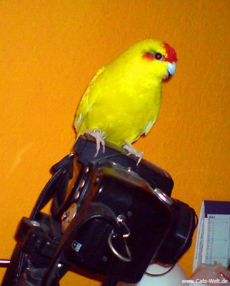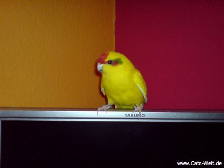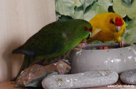 Baileys war die erste Ziegendame. die bei uns einzog. Sie sah einfach zu interessant aus und wir konnten nicht wiederstehen. Zu Hause gleich erstmal im Vogelforum informiert, damit wir auch ja nix falsch machen, stand dort dann paarweise halten und somit kam auch Whisky I in unsere Familie. Es stellte sich dann heraus das Whisky doch kein Mann ist, aber das schmälerte die Liebe der beiden zueinander nicht. Es durfte halt jeder mal oben sitzen ;). Leider verstarb Whisky I viel zu zeitig und sehr traurig (sie hatte sich einen winzigen Faden um die Beine gewickelt den wir viel zu spät sahen). Aus dem Tierheim holten wir uns dann Whisky II und gar nicht viel später folgte Jimmy. Da Jimmy vom alter her besser zu zu Baily paßte, vermittelten wir dann Whisky II und lieferten ihm dann auch noch eine Frau aus Freundeshand nach, damit auch er glücklich ist. Nun wohnten bei uns also Bailey und Jimmy, die sich sehr schnell verliebten. Ein sehr hübsches Paar. Eine gelbe Ziegenhenne und ein naturfarbener grüner Ziegenmann. Ein dreivierteljahr hatten die Beiden sich. Dann fiehl, ohne ersichtlichen Grund, Jimmy einfach von der Stange. In meiner Hand schloß er dann seine Augen und Bailey war wieder allein. Bailey war dann eine ganze Zeit nur mit den Nymphen, die wir zu der Zeit auch hatten, zusammen. Erst im August 07 zog Whisky III bei uns ein. Nach 2 Tagen waren die beiden dann ein Paar. Die ersten Tretversuche waren einfach zu lustig. Es saß verkehrtherum auf oder beide fiehlen immer wieder von der Stange. Doch wie "es" geht hatte Whisky dann schnell heraus. Bailey und Whisky liebten sich heiß und innig ;) manchmal 20x am Tag. Nach einer Weile wurde klar, da soll ein Ei kommen. Nachdem aber nix passierte nahm ich Bailey in die Hand und tastete oh schreck 2 Eier. Sofort den Vogel eingepackt und zum Tierarzt, der bei sich zu Hause Bailey auch helfen konnte und ihr mit einem satten Öleinlauf die Eier herausmassierte. Bailes bebrütete ihr Ei gab es aber nach 5 Tagen auf, weitere 2 Tage später ging es ihr schlagartig schlecht. So schlecht das ich sie herausnehmen konnte ohne gebissen zu werden. Sie nieste und verstarb dann am 14.11.07 ganz schnell in meiner Hand. Wir waren völlig geschockt, die Legenot überwunden aber sich wohl auf der Fahrt zum Tierarzt erkältet. Wir haben sie doch so genau beobachtet und trotzdem hat sie sich nichts anmerken lassen. Nun hatten wir einen einsamen unglücklichen Ziegenmann der verzweifelt seine Frau in allen Ecken suchte und nach ihr rief. Gar nicht so einfach eine neue Ziegendame zu finden. Aber im Februar 08 hat es dann geklappt. Kiwi, eine auch naturfarbene Henne wohnt nun bei uns. Und letzte Woche hat er sie gefüttert. Wir hoffen so das nun endlich Ruhe bei uns einkehrt und die Pieper Whisky III & Kiwi glücklich leben können.